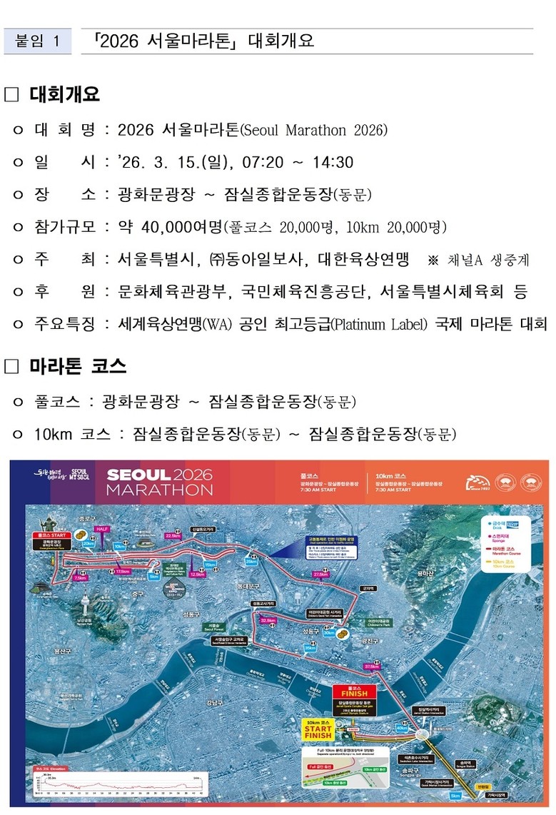 김명주 서울시 관광체육국장은 “서울마라톤은 서울의 대표 명소를 세계인과 함께 달릴 수 있도록 마련된 특별한 코스”라며, “대회 당일 일부 도로의 불가피한 교통 통제가 이루어지는 만큼 시민 여러분의 너그러운 양해와 적극적인 협조를 부탁드린다”고 말했다.