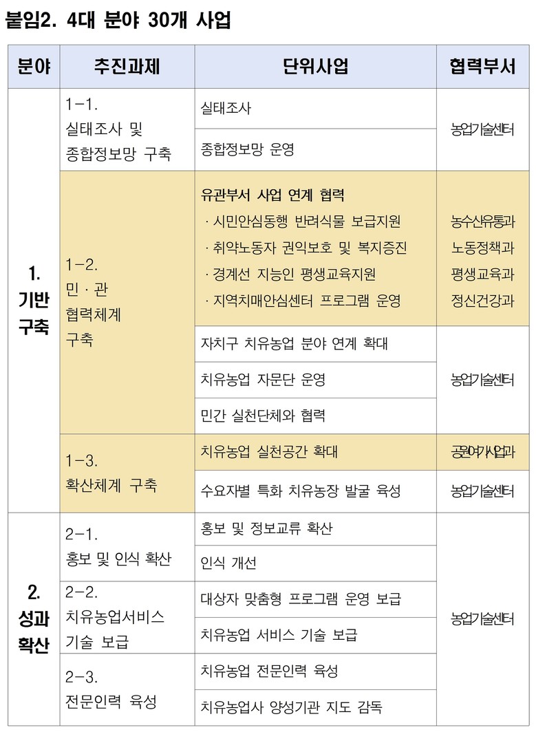 시는 생활권 기반 인프라 확충, 수요자 맞춤형 프로그램 고도화 및 전문 인력 양성, 산업화 지원 등 4대 분야 30개 핵심 정책을 5개년에 걸쳐 추진해 치유농업의 접근성과 효과성을 동시에 높일 계획이다.