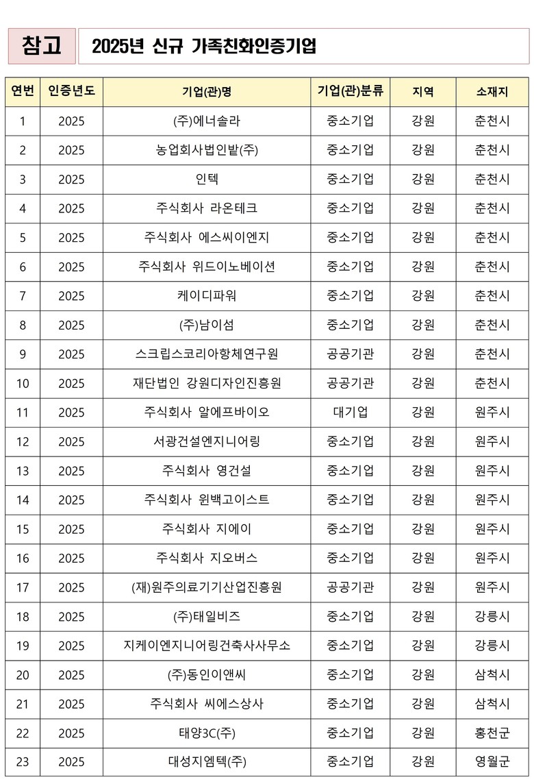 [강원도 세계타임즈=김민석 기자] 강원특별자치도(도지사 김진태)는 12월 1일 성평등가족부가 발표한 「2025년 가족친화인증기업·기관」 선정 결과, 도내 23개 기업·기관이 신규 인증을 획득했다고 밝혔다.