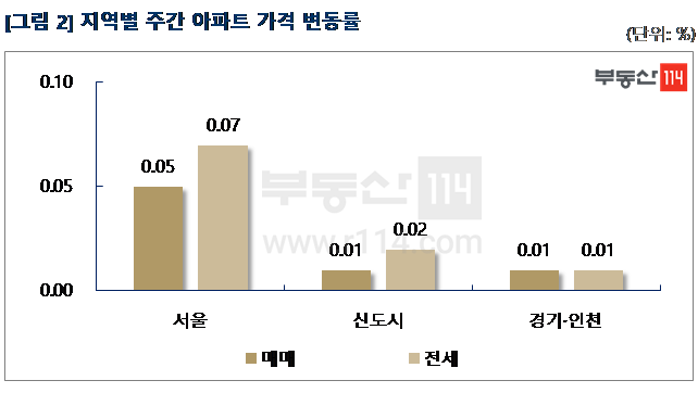 부동산114(www.r114.com)에 따르면 금주 서울 아파트값 변동률은 전주(0.06%) 대비 소폭 둔화된 0.05%를 기록했다. 재건축이 보합을 나타내며 가격 움직임이 제한된 반면, 일반 아파트는 0.06% 상승했다. 신도시는 0.01%, 경기ㆍ인천은 0.01% 올랐다.