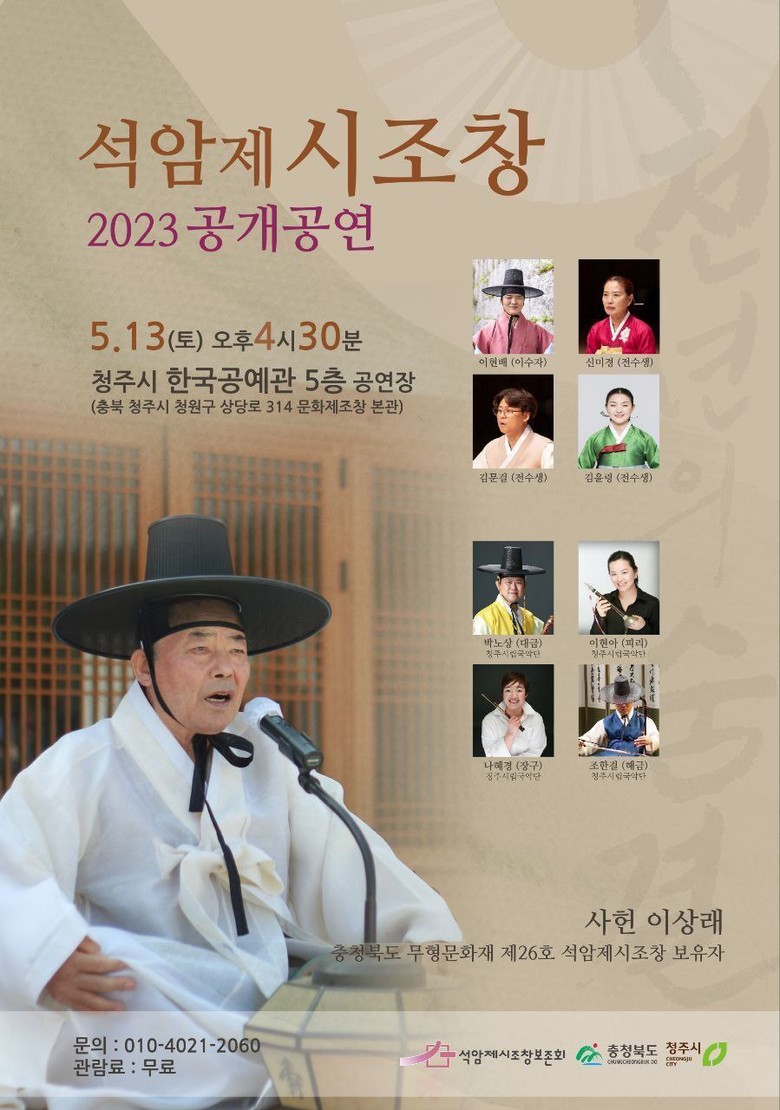 [세계타임즈 백진욱 기자] 사단법인 석암제시조창보존회에서 주최하고 충청북도와 청주시에서 후원하는 석암제시조창 2023 공개공연이 5월 13일(토요일) 16시 30분에 청주시 한국공예관 5층 공연장에서 열린다.