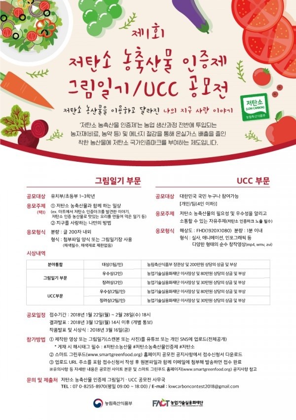 농업기술실용화재단이 22일부터 2월 28일까지 ‘제1회 저탄소 농축산물 인증제 그림일기·UCC 공모전’을 개최한다.