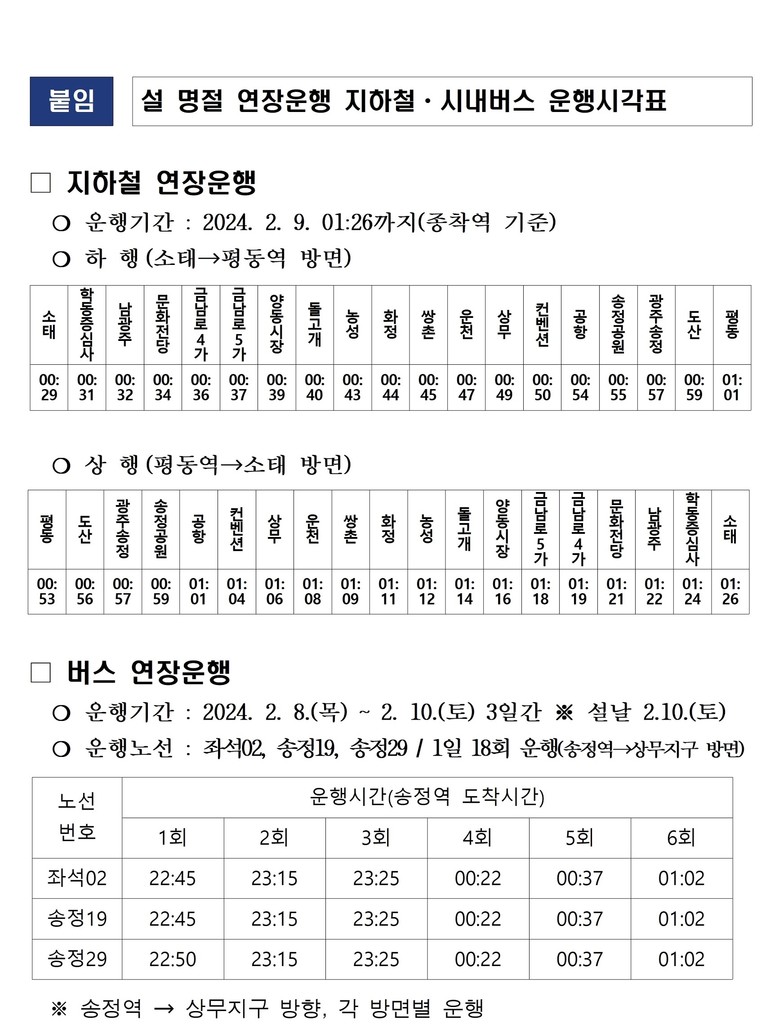 <지하철 연장운행> · 운행기간 : ’24.2.9. 01:26까지(종착역 기준) · 지하철 막차기준 출발 및 도착 시간 - (평동 출발) 00:53 (송정역 경유) 00:57 (소태 도착) 01:26 - (소태 출발) 00:29 (송정역 경유) 00:57 (평동 도착) 01:01 |