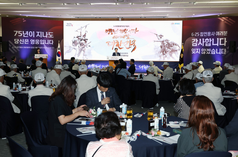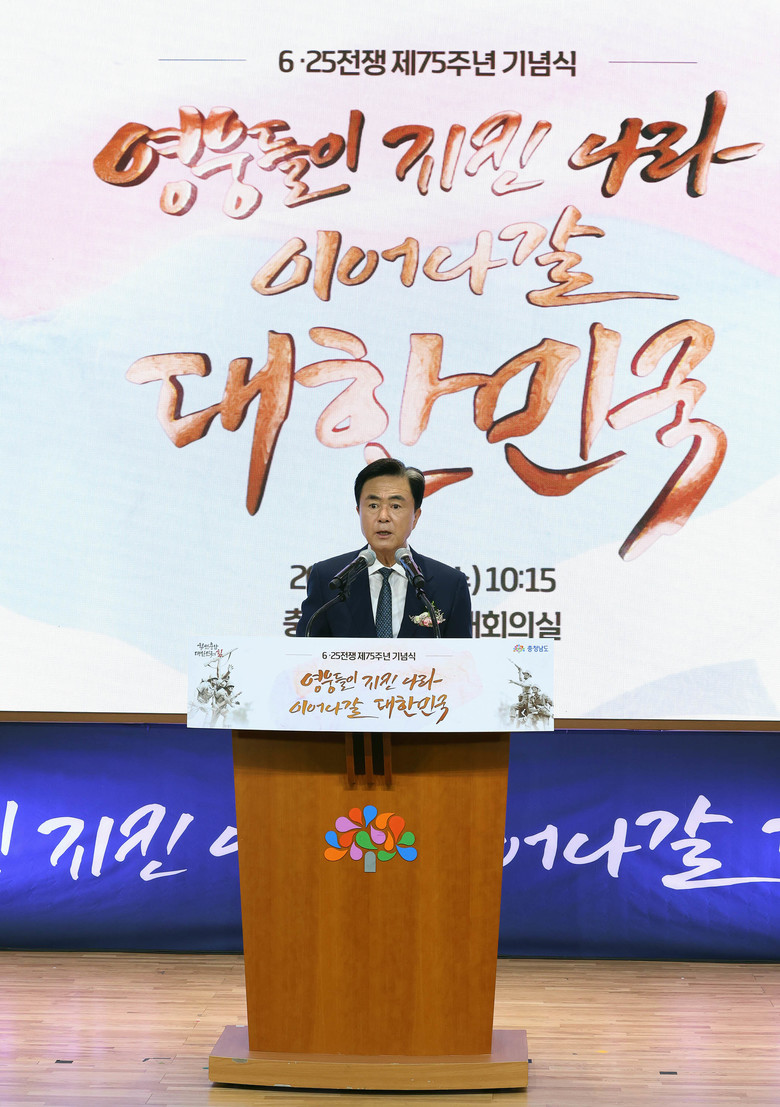 도는 25일 도청 대회의실에서 김태흠 지사를 비롯해 김지철 도교육감, 서정미 충남서부보훈지청장, 경건용(102세·1923년생) 도내 최고령 6.25참전유공자, 참전용사, 보훈단체 등 130여 명이 참석한 가운데, ‘6.25전쟁 제75주년 기념식’을 개최했다고 밝혔다.