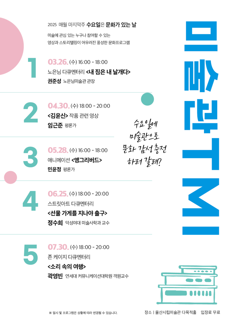 [세계타임즈=울산 이호근 기자] 울산시립미술관은 2025년 매월 마지막 수요일에 진행되는 ‘문화가 있는 날’마다 "미술관 티엠아이(TMI)" 행사를 통해 관객들의 예술적 소양과 이해를 높이는 행사를 운영한다고 밝혔다.