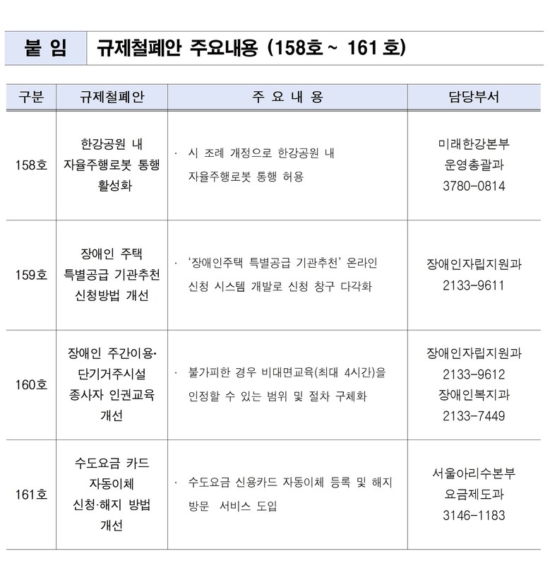 서울시는 내년 상반기 중으로 ▴한강공원 자율주행로봇 통행 허용(158호) ▴장애인주택 특별공급 기관추천 신청방법 개선(159호) ▴장애인시설 종사자 인권교육 개선(160호) ▴수도요금 카드 자동이체 개선(161호), 총 4건의 규제를 개선하겠다고 밝혔다.