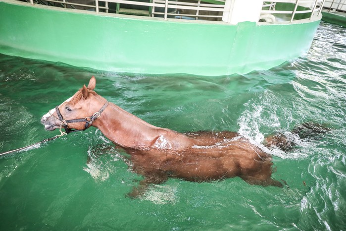 평균 체중 약500kg에서 많게는 1톤에 달하는 ‘말’은 태생적으로 수영을 한다. 야생에서는 생존을 위해 물속으로 뛰어들었겠지만 사람에게 길들어진 말은 고대 때부터 훈련을 위해 수영을 해왔다. 로마시대, 나폴레옹, 아메리카인디언 등이 전쟁을 대비해 말의 지구력 향상을 목적으로 수영훈련과 수영경주를 실시했다는 기록이 전해진다. 이는 경주마 훈련에도 적용되었다. 1937년 미국 캘리포니아에서 해안수영을 실시한 경주마들이 좋은 성적을 거뒀다는 기록이 있다. 이후 많은 국가에서 말 전용 수영장을 도입, 경주마 트레이닝을 실시하고 있다. 한국도 86년도부터 말 수영장을 개소하며 말 수영을 채택했고, 현재는 서울과 부산에 총 3개소가 운영 중이며 제주에서는 해안에서 개별적으로 시행되고 있다.