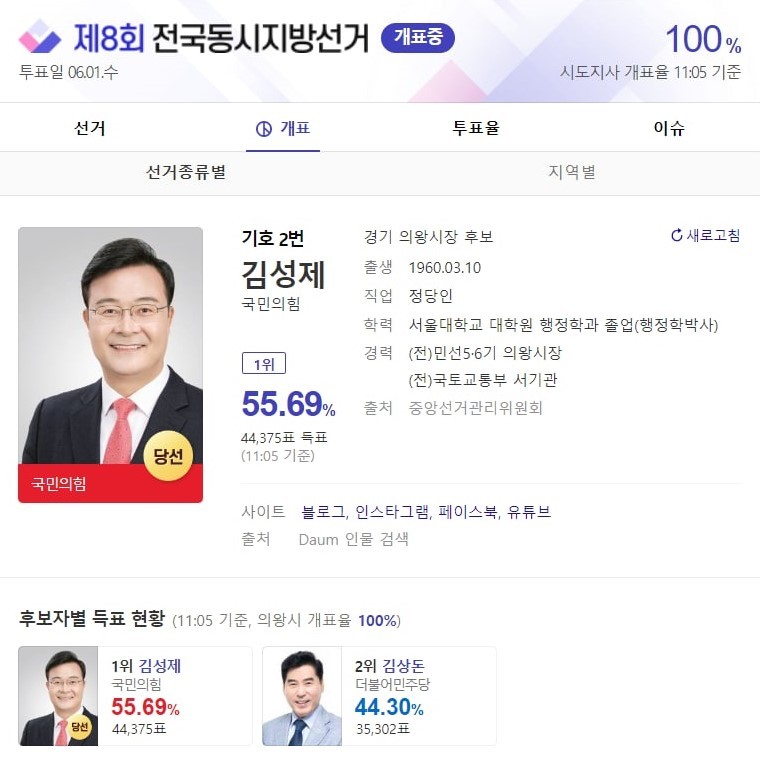 [세계타임즈 백진욱 기자] 국민의 힘 김성제 후보가 제 8회 전국동시지방선거에서 경기 의왕시장으로 당선됐다.