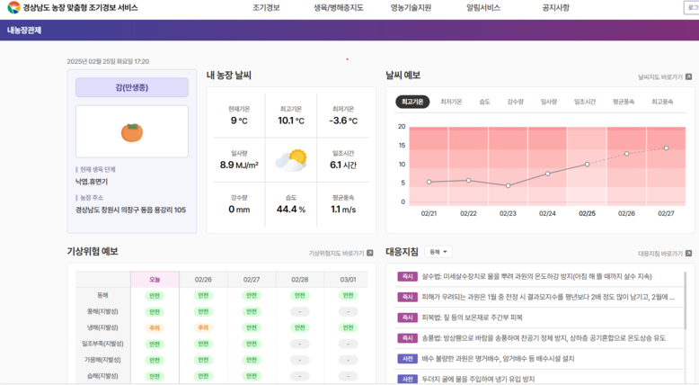 정찬식 농업기술원장은 “농장 맞춤형 기상재해 조기경보 서비스는 기후 변화 시대에 농업 현장의 애로사항을 극복하고, 기상재해 피해를 최소화하는 데 실질적인 도움이 될 것으로 기대된다”라고 말했다.