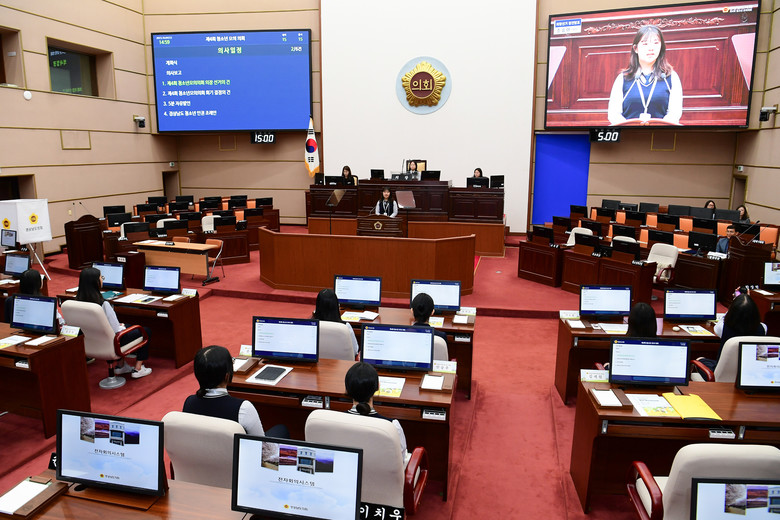 모의의회에 참여한 학생들은 1일 도의원이 되어 도의회 본회의장에서 직접 의장을 선출하고 5분 자유발언을 통해 학생 건강과 안전, 지구환경과 기후 위기, 교육과 학생 인권 등 학생들이 평소 관심을 가지고 있던 다양한 문제들에 대한 생각을 발표하고 조례안 찬반토론, 전자투표 등 체험을 통해 지방의회의 기능과 역할 그리고 민주적 의사결정 과정을 학습하는 기회를 가졌다.