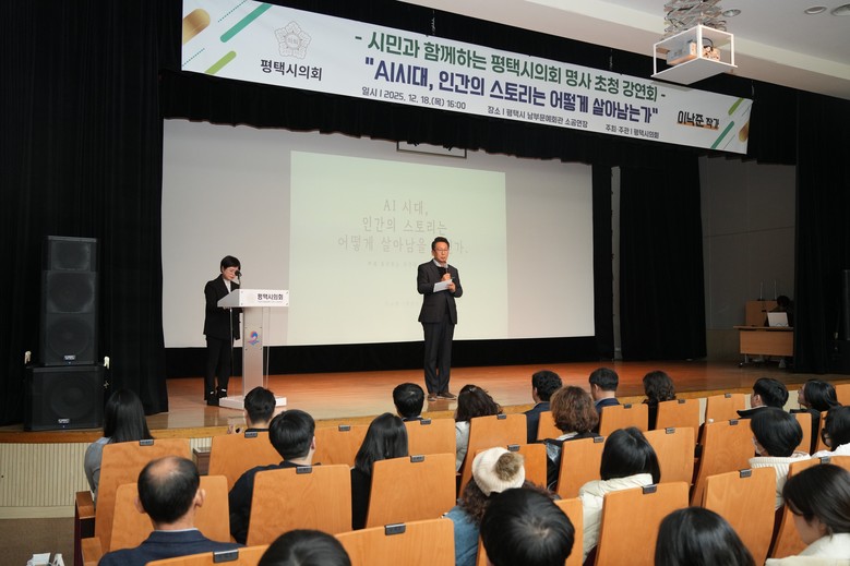[평택시 세계타임즈=송민수 기자] 평택시의회는 12월 18일, 평택시 남부문화예술회관 소공연장에서 명사를 초청해 ‘AI시대, 인간의 스토리는 어떻게 살아남는가’를 주제로 강연회를 열었다.