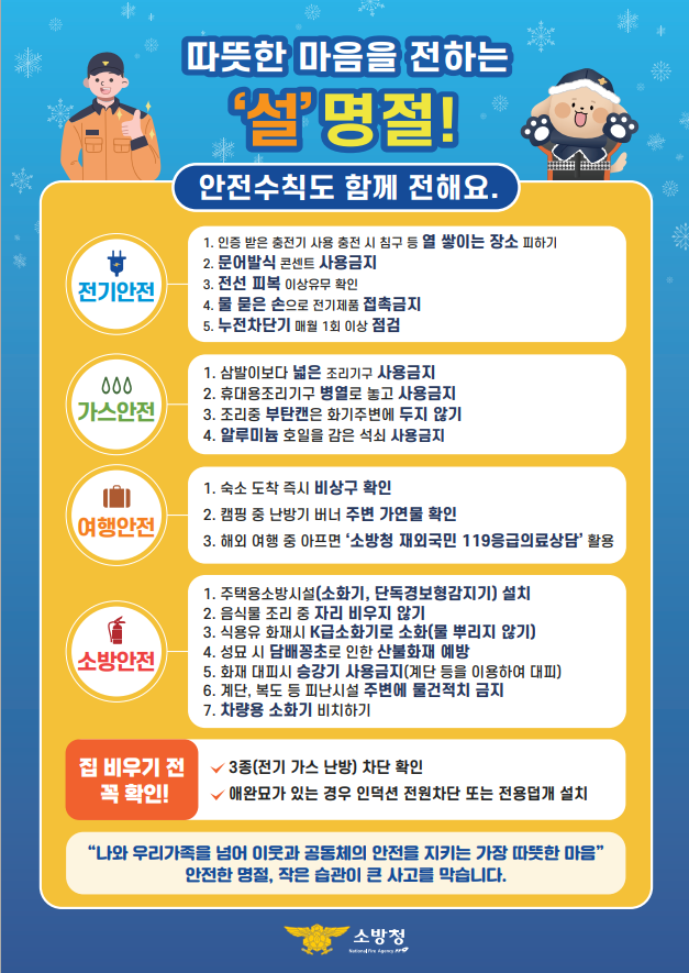 또한 소방차 출동로 확보를 위해 명절 기간 불법 주·정차 단속을 강화하고, ‘주택용 소방시설’ 설치 홍보를 통해 시민들의 자율적인 안전 확보를 독려한다.