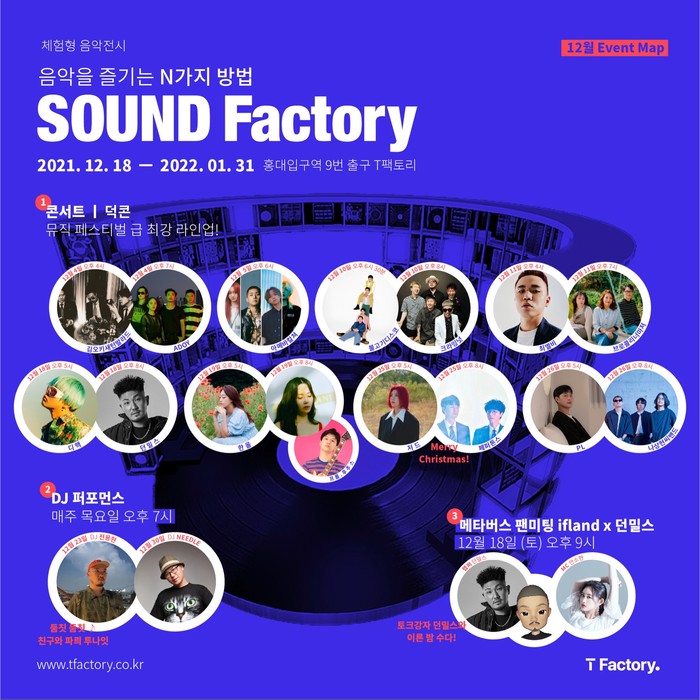 SKT는 ‘음악을 즐기는 N가지 방법’이라는 컨셉으로 T팩토리에서 ▲다양한 방법의 음악 청취가 가능한 체험형 전시 ▲아티스트 초청 ‘덕콘’ 콘서트 ▲DJ 퍼포먼스 ▲메타버스 이프랜드(ifland) 팬미팅 ▲포토존 이벤트 등의 행사를 펼칠 예정이다.