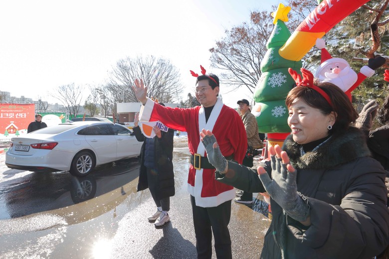 이상일 시장은 가정방문을 위해 일일산타로 분장한 100여명의 봉사자를 격려하고, 인사를 나눴다.