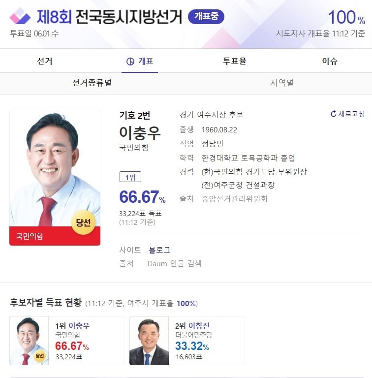 [세계타임즈 백진욱 기자] 국민의 힘 이충우 후보가 제 8회 전국동시지방선거에서 경기 여주시장으로 당선됐다.
