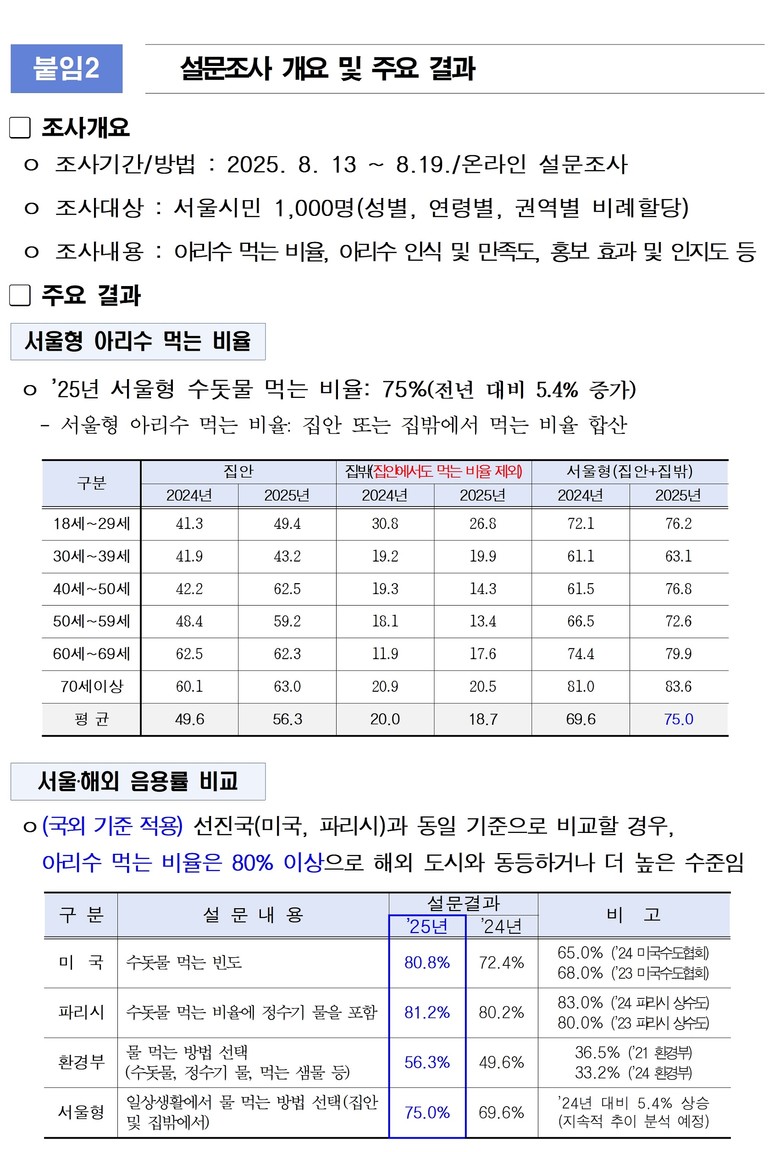 그러나 조사 범위가 가정으로 제한돼 시민들의 실제 이용 행태를 충분히 반영하기 어렵다는 점에서, 시는 지난해 전문가 자문과 시민 토론회를 거쳐 집 안과 밖에서의 음용을 모두 포함하는 ‘서울형 수돗물 먹는 비율’ 기준을 새로 마련했다.