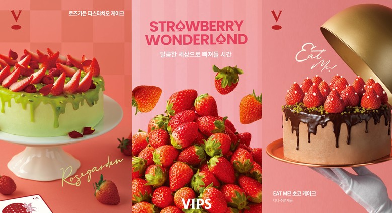 먼저 화려하고 먹음직스러운 비주얼의 케이크들이 눈길을 끈다. ‘체셔캣 트리플 베리 케이크’, ‘로즈가든 피스타치오 케이크’, ‘EAT ME! 초코 케이크’, ‘카드병정 초코쿠키 치즈케이크’, ‘떠먹는 화이트래빗 요거트 크림 케이크’ 등 딸기와 완벽한 조화를 이루는 케이크들이 마련돼 있다.