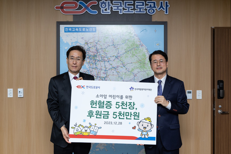 [세계타임즈 = 이영진 기자] 한국도로공사(사장 함진규)는 지난 28일(목) 한국백혈병어린이 재단에 소아암 어린이 환자들의 치료 지원을 위해 헌혈증 5천장과 치료비 5천만원을 전달했다고 밝혔다.