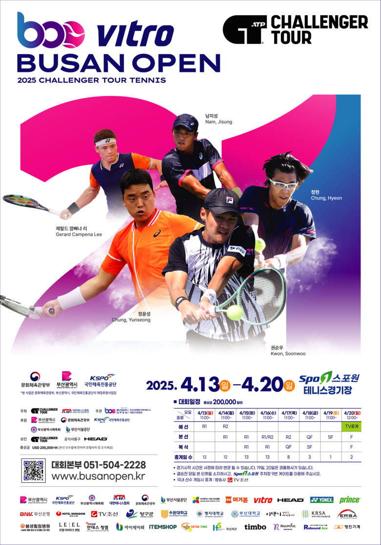 ◈ ▲4.13.~4.19. 단·복식 예선과 본선 ▲4.20. 11:00 단·복식 결승전 진행돼… 전 경기 무료로 관람할 수 있어 [부산 세계타임즈=이용우 기자] 부산시(시장 박형준)는 4월 13일부터 20일까지 금정체육공원 테니스경기장에서 「2025 부산오픈 국제 챌린저 테니스 대회(이하 부산오픈)」가 개최된다고 밝혔다.