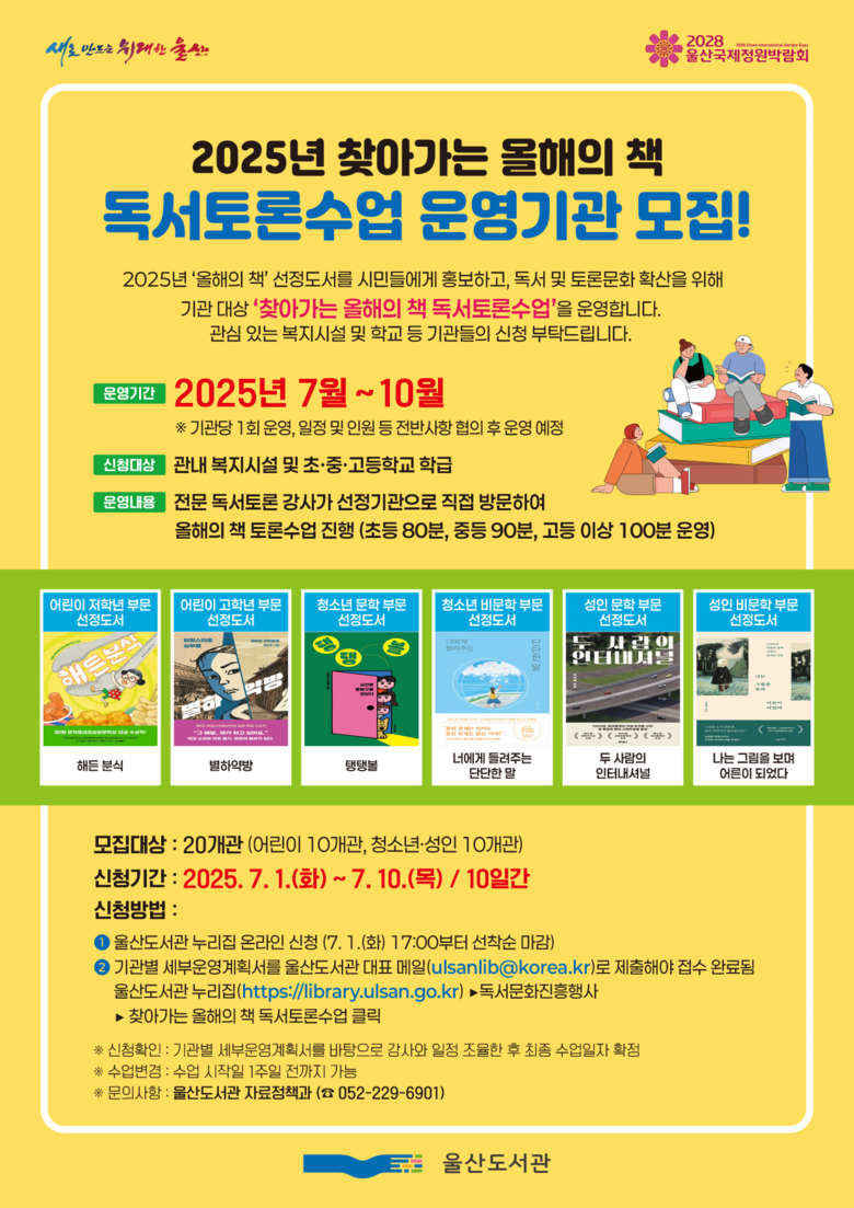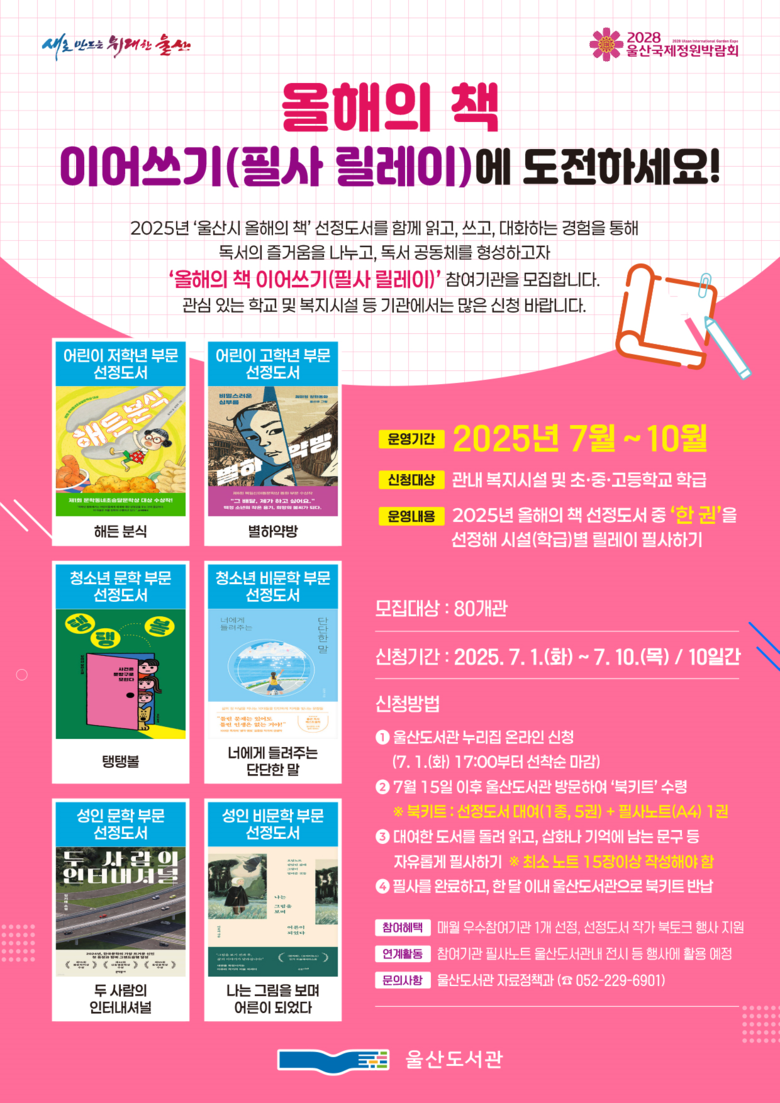 참여 기관 모집은 7월 1일 오후 5시부터 울산도서관 누리집(library.ulsan.go.kr)을 통해 선착순으로 진행된다. 자세한 문의는 울산도서관 자료정책과(☎052-229-6901)로 하면 된다.