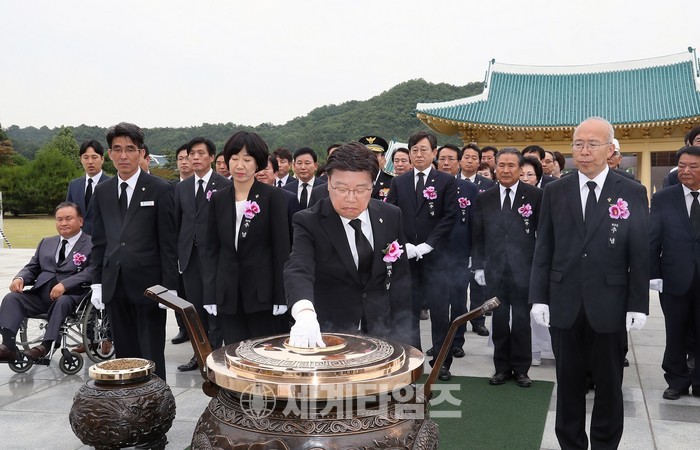 [대전=세계타임즈 이장성 기자] 권선택 대전광역시장이 6일 대전 유성 국립대전현충원에서 열린 제62회 현충일 추념식에서 참석자들과 함께 분향하고 있다.