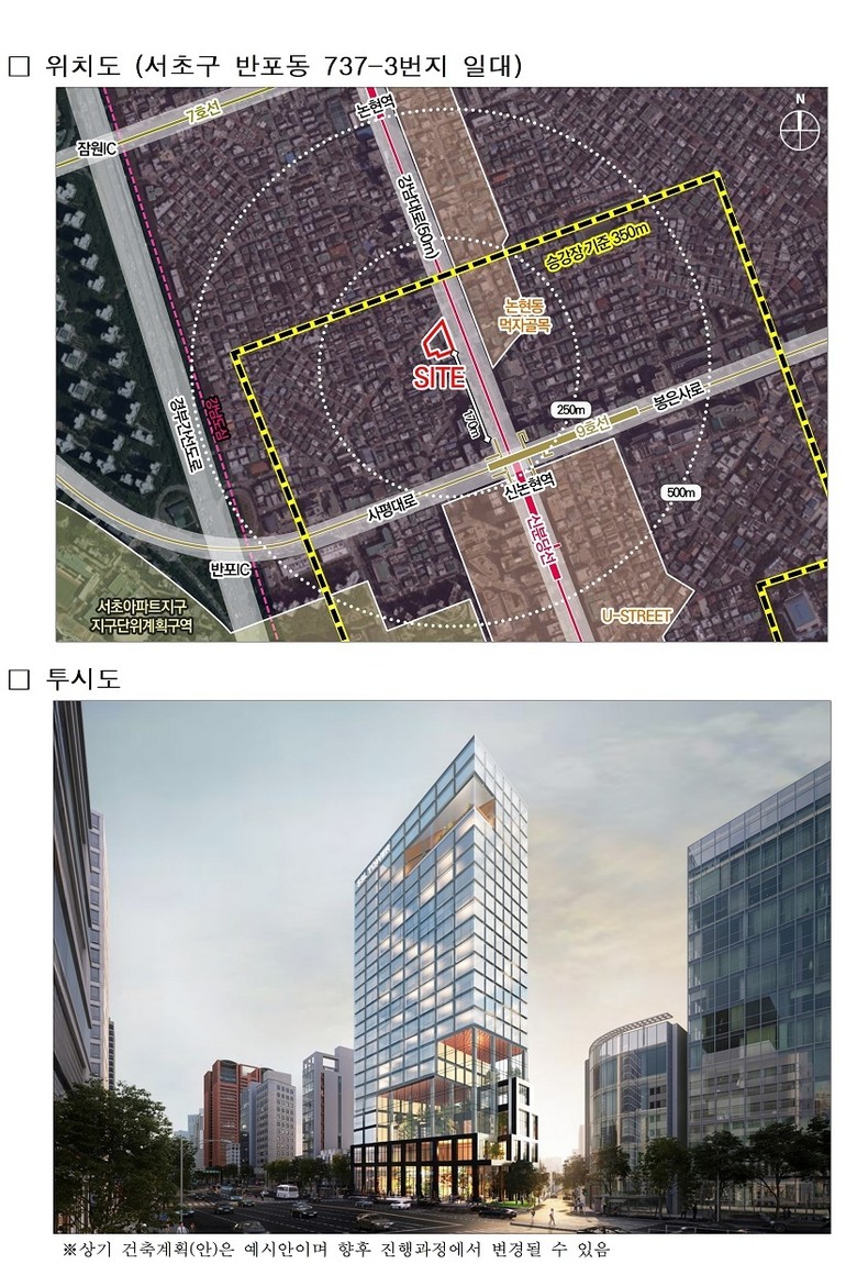 또한 강남대로변과 이면부가 연결되는 위치에 공개공지 275㎡ 뿐 아니라, 건축물 내에는 문화공간과 연계된 입체정원 등 다양한 녹지공간을 조성하여 주변 상업·문화시설과 연계한 활기찬 가로를 조성한다는 계획이다.