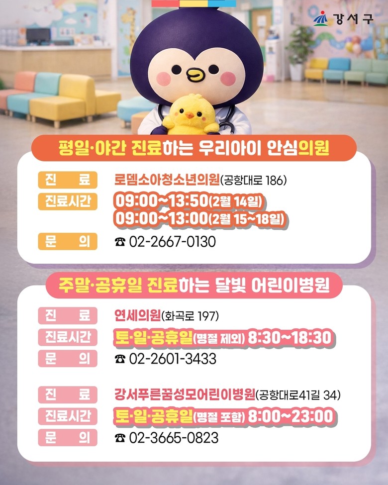 특히, 야간과 휴일에도 소아 진료를 책임지는 달빛어린이병원으로 지난해 지정된 ‘강서푸른꿈어린이성모병원(공항대로41길 34)’과 새벽 1시까지 운영하는 심야약국 ‘365열린약국(공항대로41길 52)’이 포함된다.