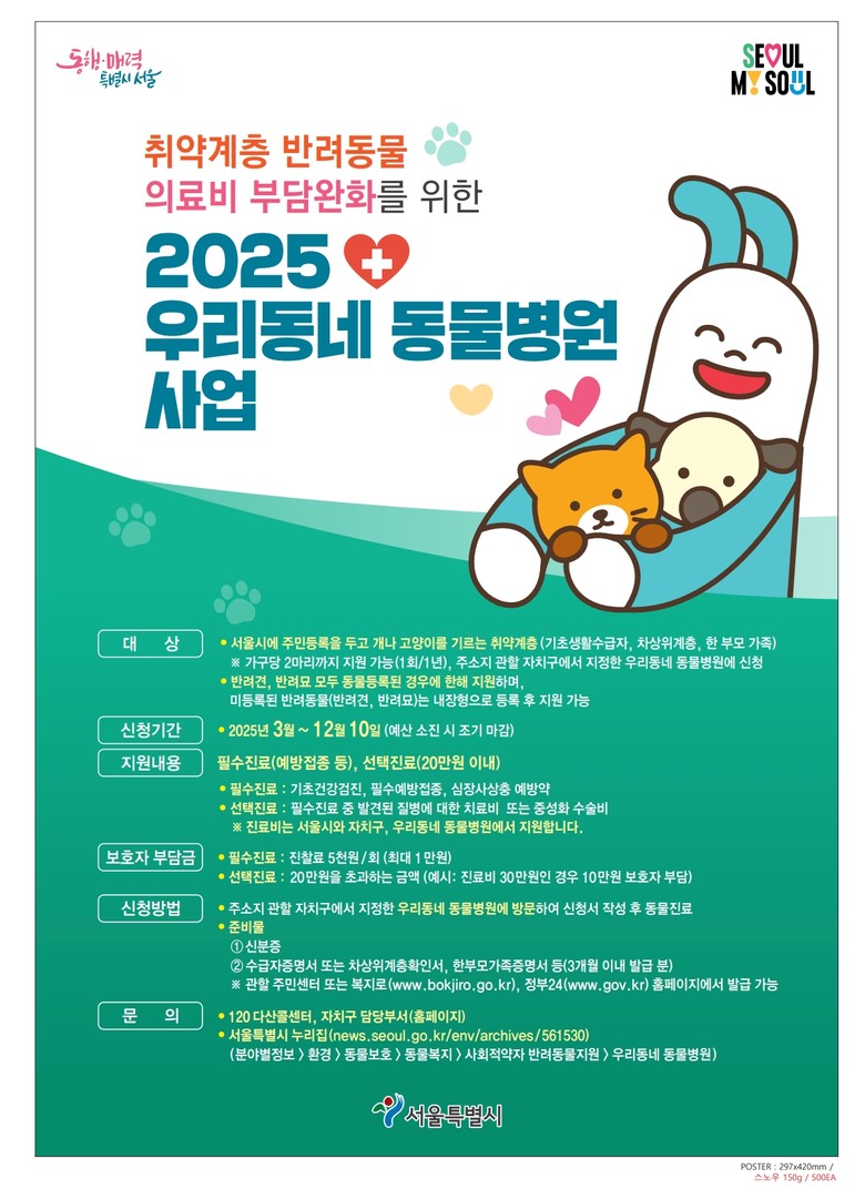 박희영 용산구청장은 “취약계층 주민들이 가까운 지정 병원에서 부담 없이 반려동물의 진료와 치료를 받을 수 있도록 적극 안내하겠다”고 밝혔다.
