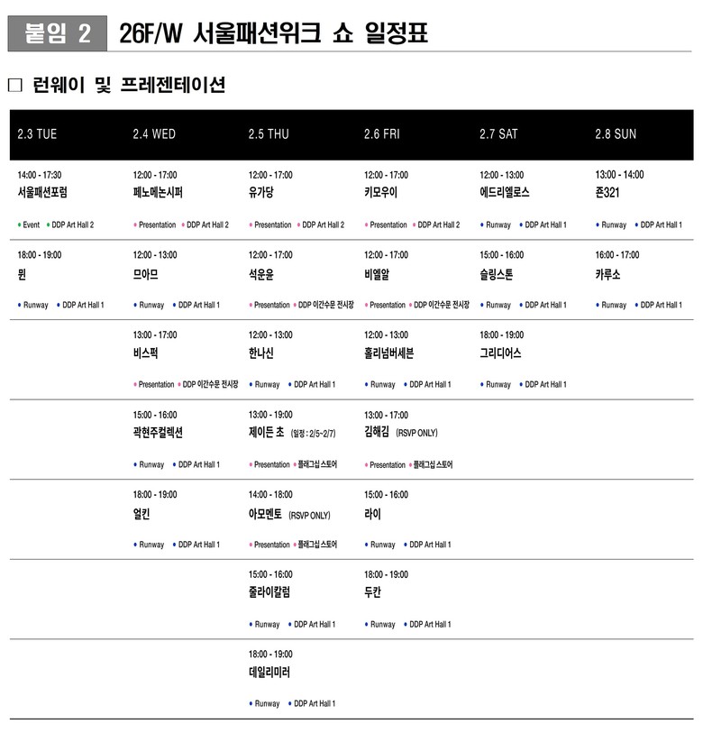 특히 이번 시즌은 운영 효율을 고려한 ‘전략적 편성’이 적용됐다. 하루 2~3개의 쇼를 약 3시간 간격으로 배치해 입장, 무대 전환, 재정비 과정이 원활히 이뤄지도록 구성했으며, 쇼 사이 시간에는 프레젠테이션 및 쇼룸 방문이 자연스럽게 이어지도록 동선을 설계했다. 이는 패션 관계자와 바이어가 컬렉션과 브랜드를 끊김 없이 경험할 수 있도록 하기 위한 전략이다.