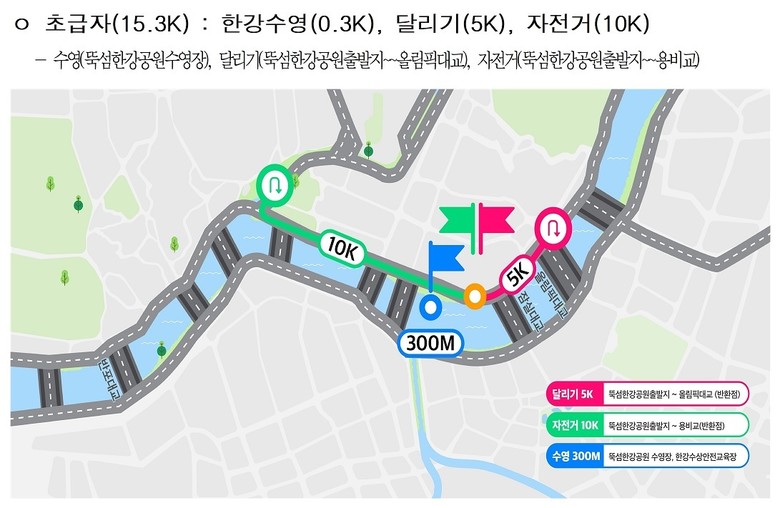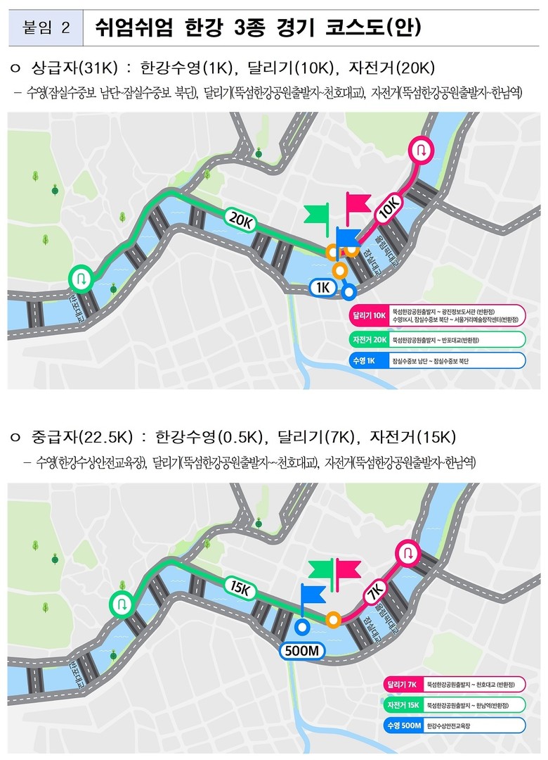 3종 경기 코스는 운동이 익숙하지 않은 초급자부터 숙련된 동호인까지 모두 참여할 수 있도록 구성했다. 특히 중급자 코스를 새롭게 도입함으로써, 보다 많은 시민이 자신의 속도에 맞게 완주의 즐거움을 경험할 수 있도록 했다.