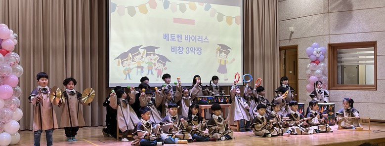 | ▲ 효천다솜유치원 졸업식에서 졸업생들이 리듬합주 공연을 하고 있다 |
