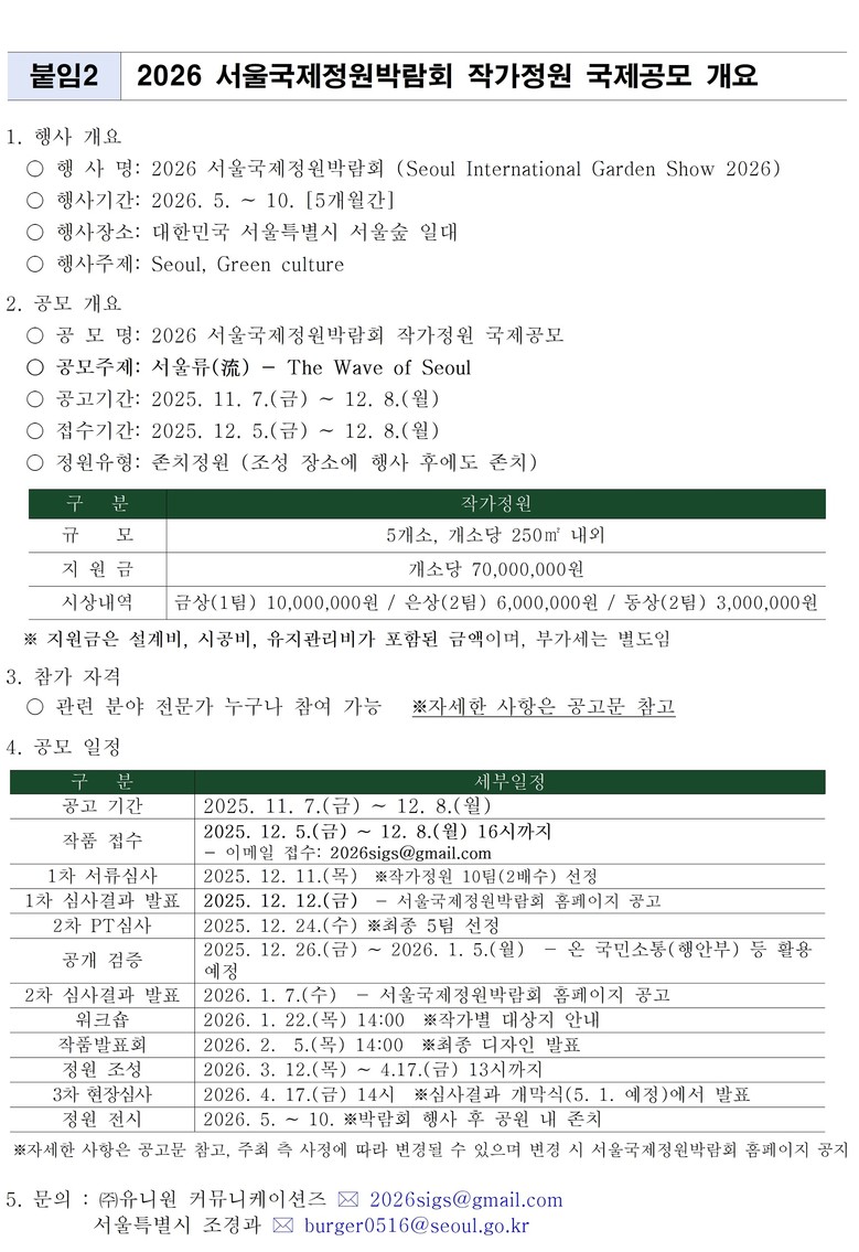 ‘2026 서울국제정원박람회 작가정원 국제공모’ 작품 접수는 12월 5일(금)부터 12월 8일(월) 16시(한국시각‧GMT+9)까지 진행된다. 공모에 대한 자세한 사항은 서울시 누리집(고시‧공고) 및 서울국제정원박람회 누리집(festival.seoul.go.kr/garden) 등에서 확인할 수 있다.