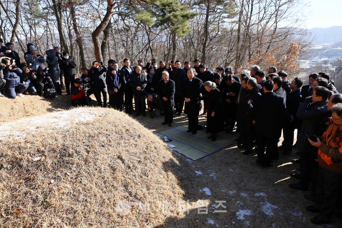 반기문 전 유엔 사무총장과 부인 유순택 여사가 14일 반 전 총장의 고향인 충북 음성군 원남면 상당리 행치마을의 선친묘소를 참배하고 있다. 2017.01.14.