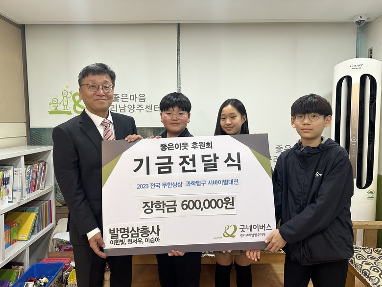 서태원 굿네이버스 경기구리남양주지부장은 “발명삼총사 팀의 수상을 축하하며 지역사회 내 위기가정을 위한 나눔에 앞장서 주심에 감사드리고, 전달받은 후원금은 지역사회 아동들의 경제적·심리적 어려움을 해결하기 위해 사용될 수 있도록 소중하게 전달하겠다”라고 전했다.