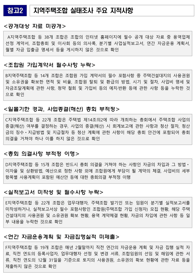 조합별 세부 지적사항은 외부에 공개될 경우, 사업 추진에 영향을 줄 수 있어 해당 조합원에 한해 확인할 수 있도록 각 조합 누리집에 공개한다.