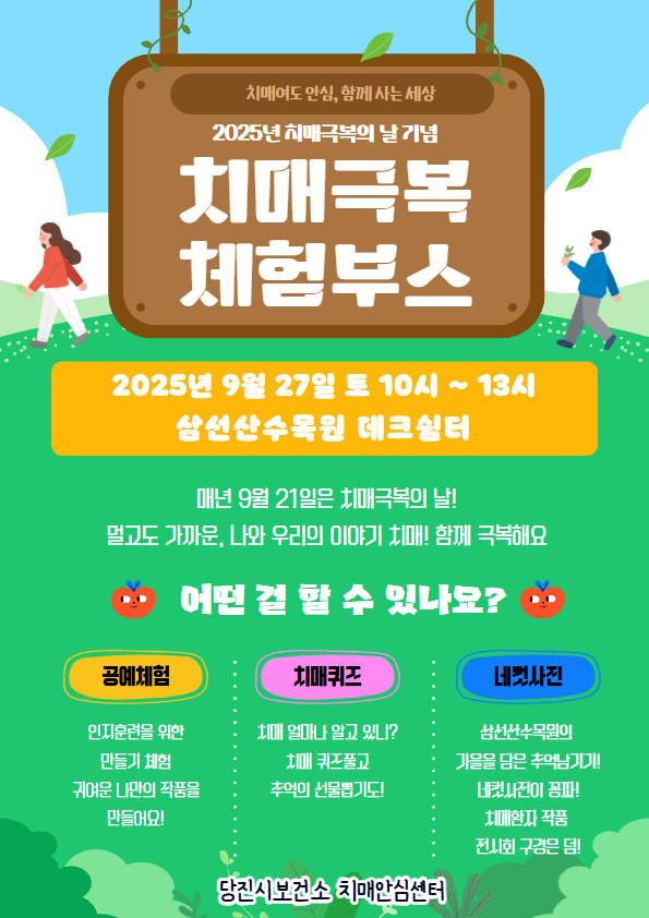 ‘함께 사는 세상, 치매극복 체험부스’는 9월 27일 토요일 10시~13시 삼선산수목원에서 진행한다. 치매극복에 관심이 있는 당진시민이라면 누구나 참여할 수 있으며 △치매안심센터 사업 홍보 △인지 강화 만들기 체험 △치매 바로 알고 퀴즈 풀기 등 다양한 캠페인과 이벤트에 참여할 수 있다.