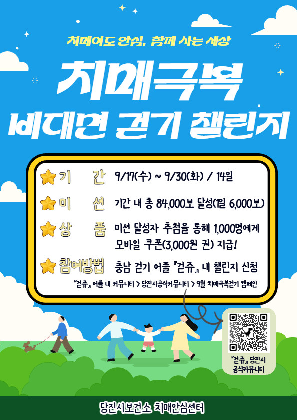 ‘치매여도 안심, 함께 사는 세상 치매극복 걷기 챌린지’는 모바일 「걷쥬」 앱을 통해 참여할 수 있다. 모바일 「걷쥬」 앱 내 당진시 공식 커뮤니티에 가입해 해당 챌린지를 신청한 후, 걷기 주간인 9월 17일~30일까지 14일간 8만 4000보 이상 달성하면 추첨을 통해 1,000명에게 소정의 상품을 증정한다.