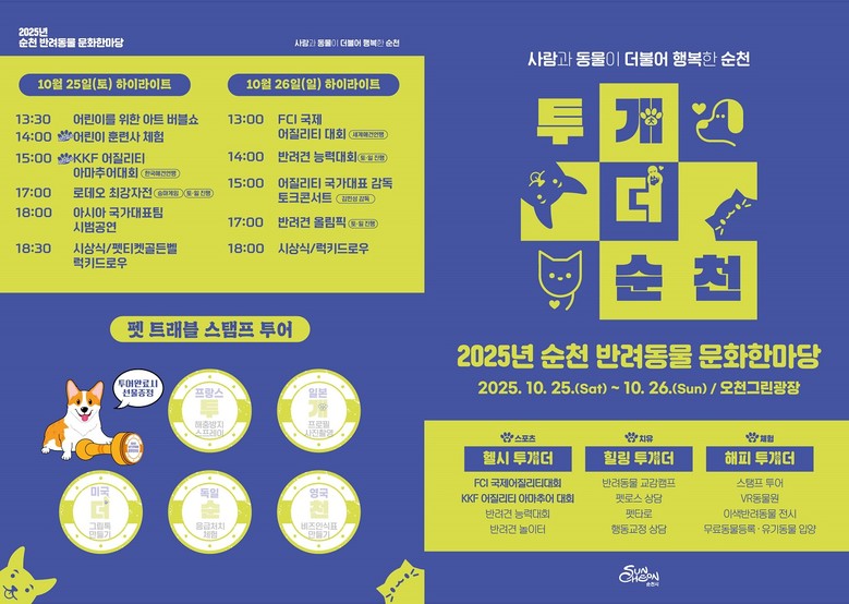 - 사람과 동물이 더불어 행복한, 동물 교감 치유도시 지향 [세계타임즈=순천시 우덕현 기자] 순천시(시장 노관규)는 오는 25일(토), 26일(일) 양일간 오천그린광장에서 반려동물은 물론 반려인과 비반려인이 함께 즐기는 ‘2025년 반려동물 문화한마당 행사’를 개최한다고 밝혔다.