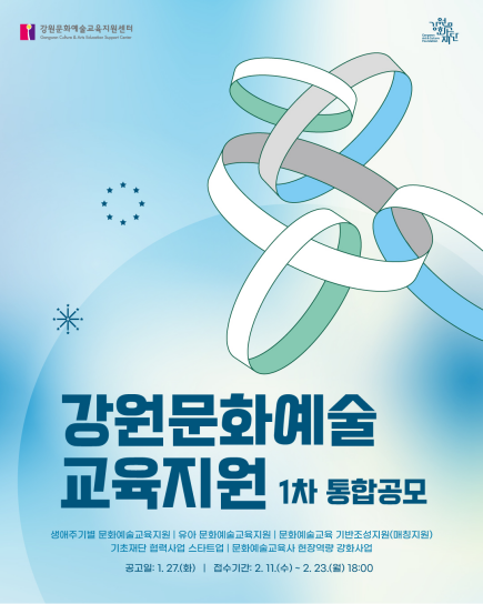강원문화재단 신현상 대표이사는 “이번 통합공모에 기존 참여 단체뿐 아니라 새로운 단체들의 적극적인 참여를 기대한다”며, “다양한 주체의 참여를 통해 문화환경 취약지역까지 문화예술교육이 확산되고, 더 많은 도민이 일상에서 문화예술교육을 향유할 수 있길 바란다”고 전했다.
