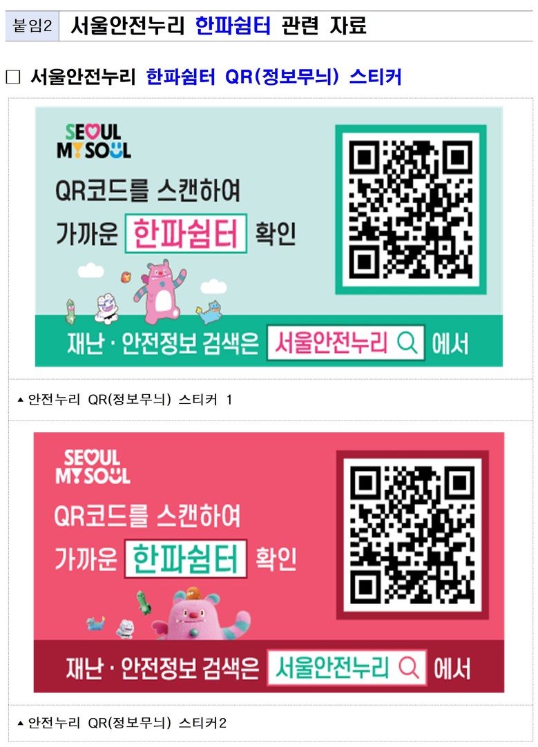 한파쉼터 등에 대한 정보 제공도 강화한다. 서울시 재난안전정보 포털 ‘서울안전누리’와 각종 시설에 부착한 QR코드(정보무늬) 스티커를 통해 한파쉼터의 위치와 상세 운영 정보를 제공한다.