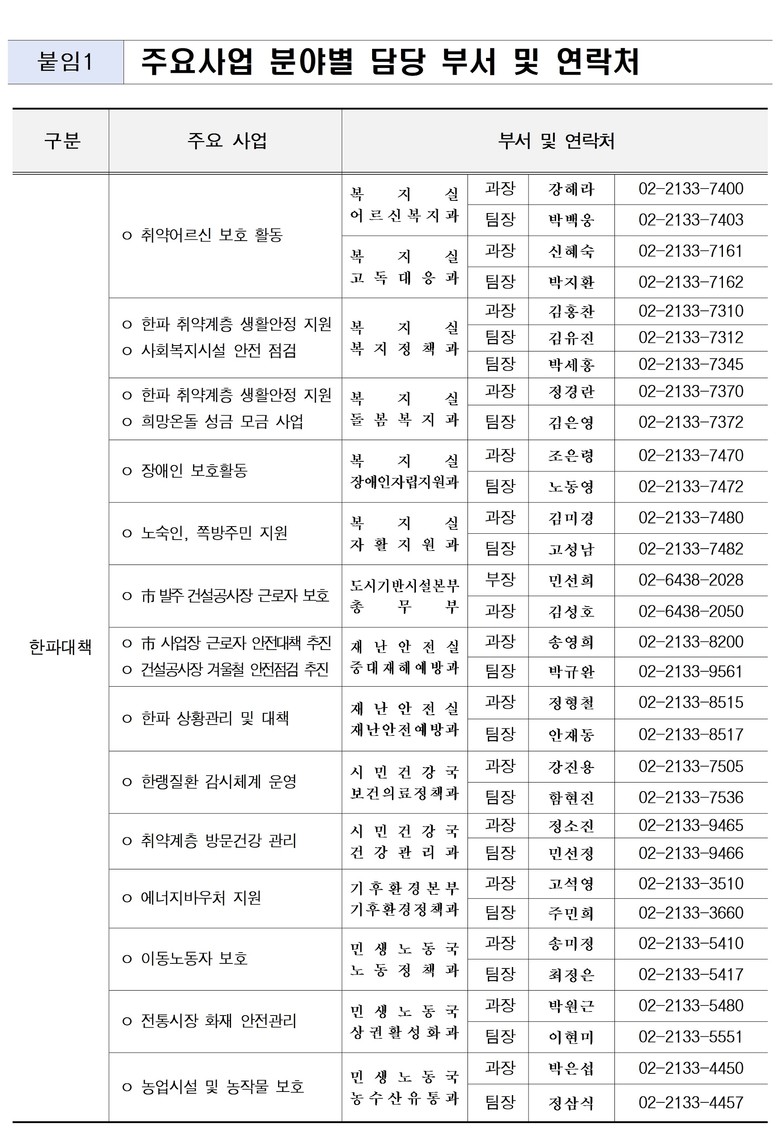 - 노숙인·쪽방주민·취약어르신·장애인 등 한파 취약계층 대상별 맞춤형 돌봄활동‧보호대책 추진