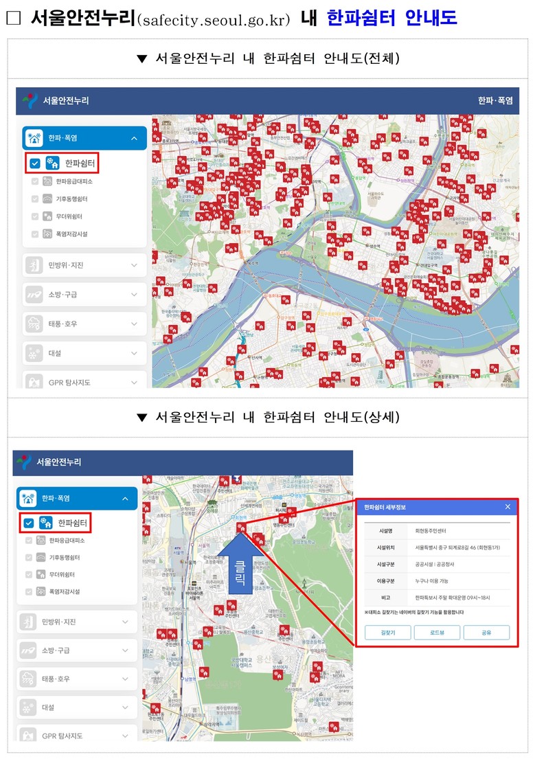 시민행동 요령과 한파 정보도 신속하게 전달한다. 지하철 모니터, 전광판 등을 통해 시민행동요령을 안내하고, 시 홈페이지‧SNS‧서울안전누리(safecity.seoul.go.kr) 등을 통해 재난 속보를 빠르게 제공한다.