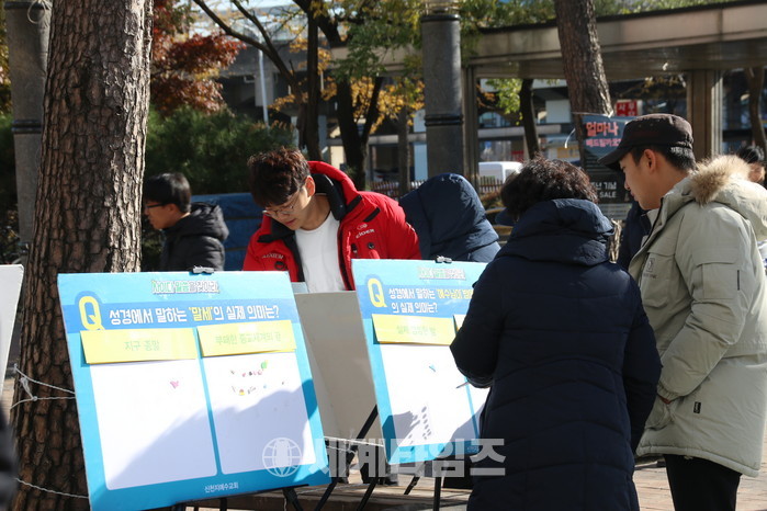 이날 안산시온교회는 시민과 직접 만나 기성교단의 음해로 오해를 받고 있는 부분을 바르게 알리고 기성교단과의 교리를 비교하는 자료로 ‘성경에서 말하는 말세의 실제 의미는?’ 외 5개의 자료를 통해 시민이 직접 선악을 가릴 수 있는 자리를 마련했다.