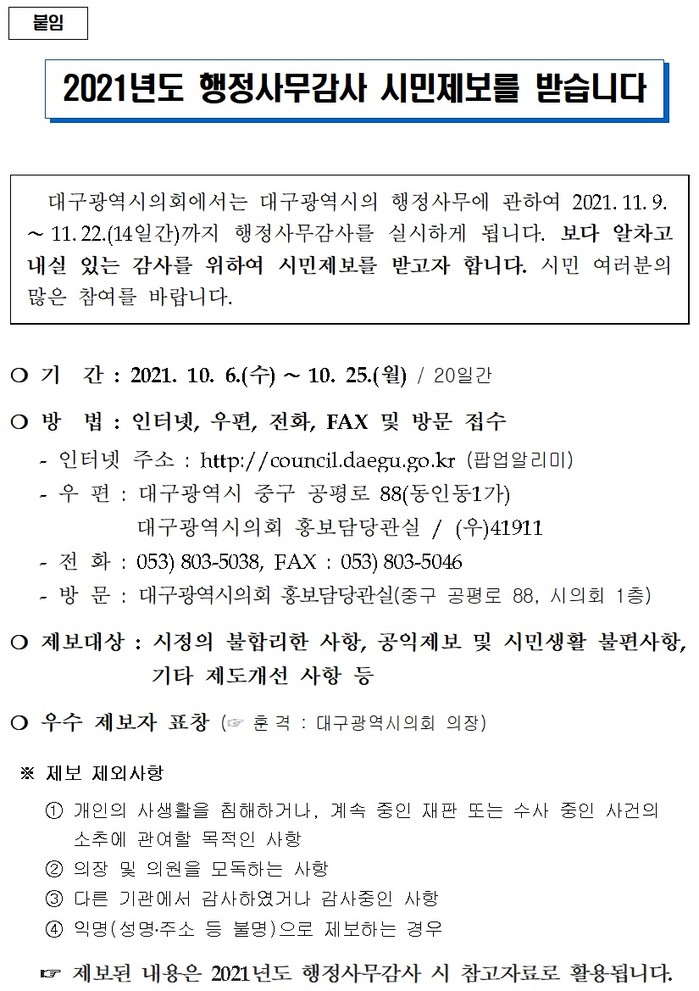 접수된 제보는 2021년 행정사무감사 참고자료로 활용되고, 제보내용의 처리결과는 감사 종료 후 제보자에게 개별 통지할 예정이다.
