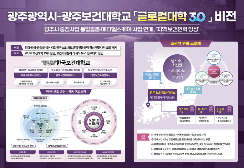 - 광주시, 올해부터 5년간 400억 지원…지산학 연계 보건의료산업 육성 [세계타임즈=광주 손권일 기자] 광주보건대, 대구보건대, 대전보건대로 구성된 ‘한달빛 글로컬보건연합대학’이 28일 교육부 ‘글로컬대학 30 사업 대학’으로 최종 선정됐다.
