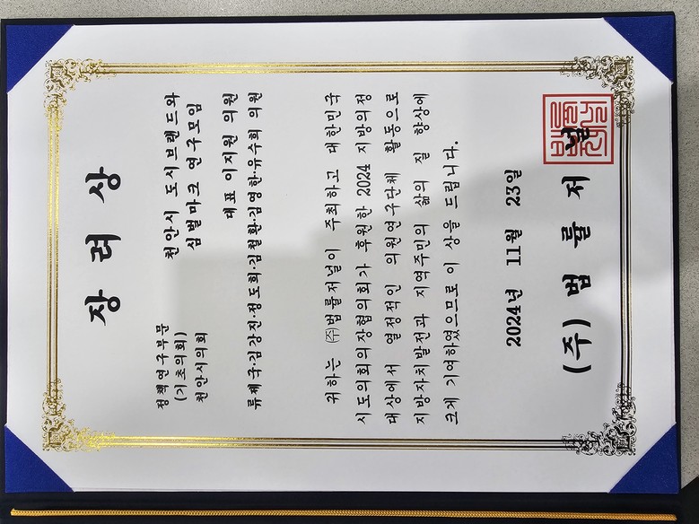 [천안시 세계타임즈=백택기 기자] 충남 천안시의회(의장 김행금)는 ‘천안시 도시브랜드와 심벌마크 연구모임’(대표의원 이지원)이 ‘2024 지방의정대상 정책연구부문’에 선정돼 장려상을 지난 23일 수상했다고 25일 밝혔다.