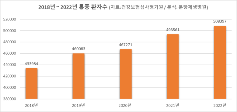 | ▲2018년~2022년 통풍 환자수(자료: 건강보험심사평가원/ 분석:분당제생병원) |