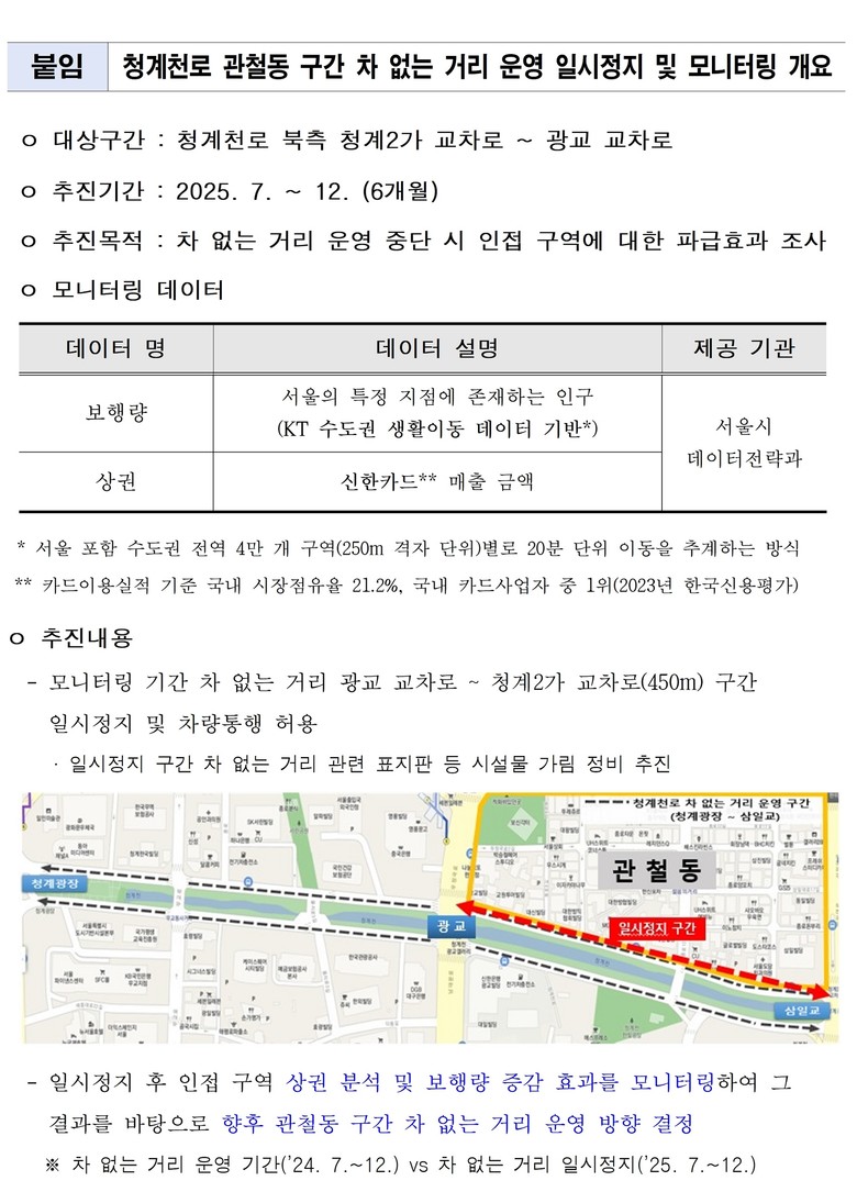 서울시는 ‘차 없는 거리’ 영향에 대한 객관.실증적 데이터 수집을 위해 올해 7~12월 일시적으로 차량 운행을 허용하는, 일종의 정책실험 기간을 가졌다. 시는 일시 정지 기간 중 수집한 관철동 인근 데이터를 토대로 차 없는 거리 운영 전.후를 비교할 계획이다.