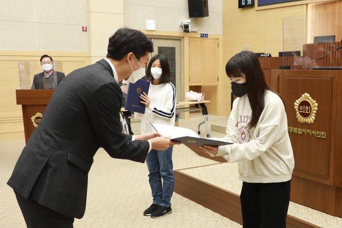 이태환 의장은 수상한 학생들을 축하하며, “자신도 어린 시절의 꿈을 실현해 이 자리에 서게 되었다”면서 “내년에도 더 많은 청소년들에게 의미 있는 의회 체험의 기회를 제공할 수 있도록 의회교실을 확대하는 등 노력하겠다”고 말했다.
