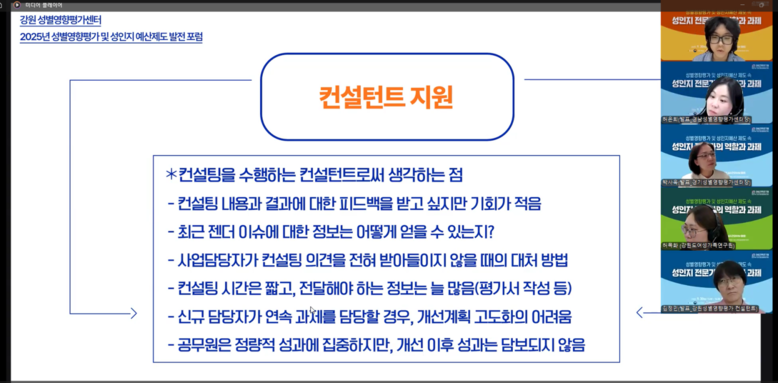 포럼은 주제발표와 지정토론으로 이어졌다. 제도 운영에서 성인지 전문가의 역할과 과제에 대해 김정민 강원성별영향평가센터 컨설턴트가 발표했고, 컨설턴트와 공무원의 협업 과정이 성공하기 위한 요건과 제도 개선 방안에 대해 박사옥 경기성별영향평가 센터장이 발표했다. 이어 성별영향평가 컨설턴트단 운영을 위한 센터의 역할과 과제에 대해 허은희 경남성별영향평가센터 센터장이 발표했다. 각 주제발표에 후에 서지희 서울성별영향평가센터 전담연구원, 윤금이 천안시 여성가족과 성평등전문관, 남정연 중앙성별영향평가센터 전담연구원이 토론을 진행했다. 마지막으로 참여자 전원이 참여하는 라운드테이블 토론을 통해 성별영향평가·성인지예산 제도 발전을 위한 다양한 의견을 들었다.